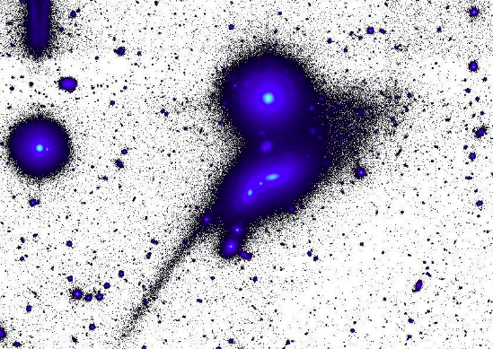 300,000,000 light-years away, a gigantic fledgling swims through space. This "fledgling" galaxy has a tail that is an incredible 500,000 light-years long, and is multiple times longer than the Milky Way.